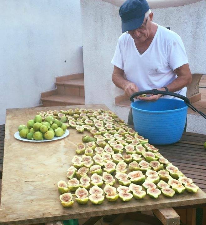 Con una precisione geometrica i fichi, quando ancora batte forte il sole, vengono “spaccati” a metà e messi a seccare, su tavole di legno.