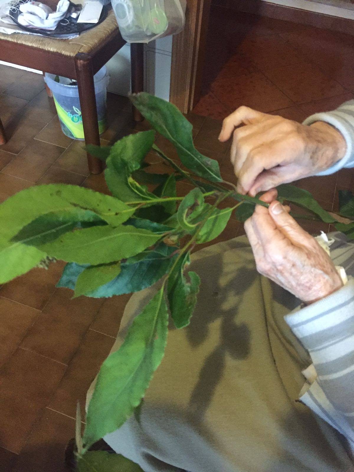 Augusto svolge il suo lavoro con pazienza, aiutato da sua sorella Maria, impiegata a staccare le foglie dai rami di alloro e ad infilare, quasi come un gioco di mattoncini per bambini, i “panini” di fichi sulle cannette, “gli spruoccoli”, in gergo napoletano.