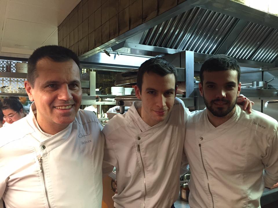 Oriol Castro nella cucina del Disfrutar con due collaboratori