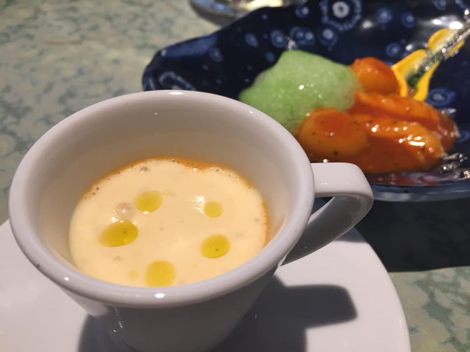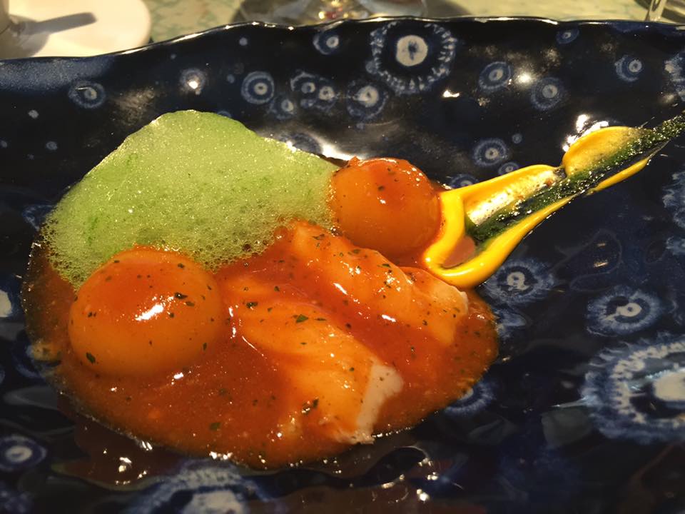 Le espardenyes (i cetrioli di mare, frutti di mare tipici della costa catalana) sono ridotti in noodles e preparati alla gallega, in una gradevole zuppa iodata. Mentre la salsa suquet, tipica delle zuppe di pesce della cucina valenziana è utilizzata per gli scampi e nel cappuccino di patate. Forse la sequenza più confortevole e rassicurante del menu.