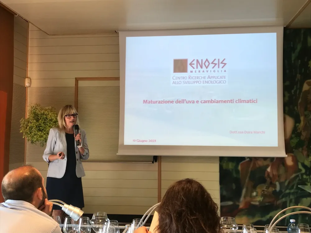 Prima della degustazione, prezioso è stato l’intervento della professoressa Dora Marchi, Direttore Tecnico e Responsabile del Laboratorio Controllo Qualità di Enosis, chiamata a fare il punto sul cambiamento climatico in corso, dando rilievo agli effetti che questo comporta nel vino partendo dal vitigno Nebbiolo da Barolo.