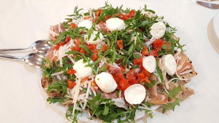 Una delle più richieste è quella tradizionale con pomodorini, rucola, scaglie di Grana Padano, prosciutto di Parma, mozzarella di bufala campana, origano e olio extravergine di oliva.
