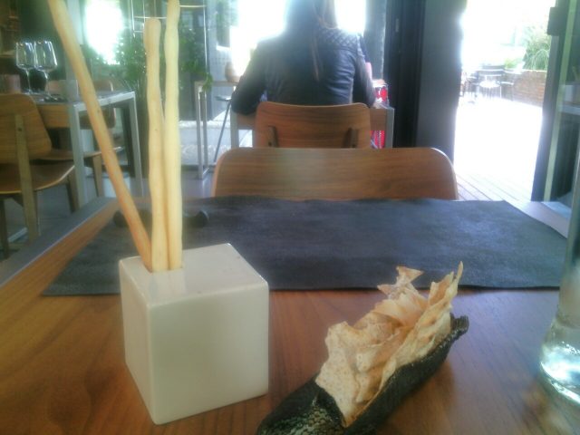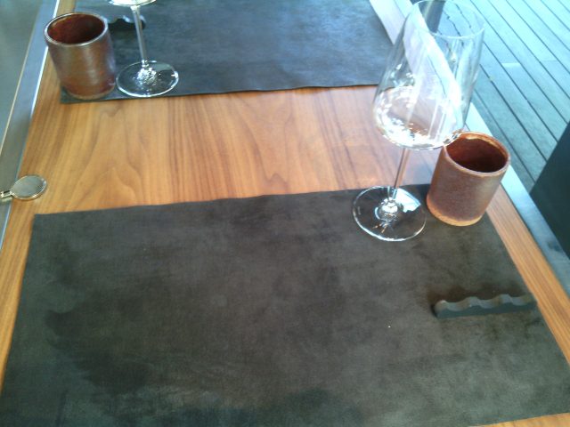 Per iniziare il pranzo la divertente trovata di apparecchiare da sè la tovoglietta di cuoio nero, pescando le posate dal cassetto del tavolo, come ai banchi di scuola. Essendo primo autunno non potevano mancare piatti volti a nobilitare le verdure del periodo, spesso snobbate perchè poco saporite. Nel semplice sta il complesso, a volte persino l’estremo piacere, questa la sintesi del perfetto piatto d’entrata, “Giardino galleggiante”, broccoli, sedano rapa, patate al burro, con susine e mele acerbe, servite su una fonduta al parmigiano e yogurt: fresco, acidulo e al contempo estremamente voluttuoso.