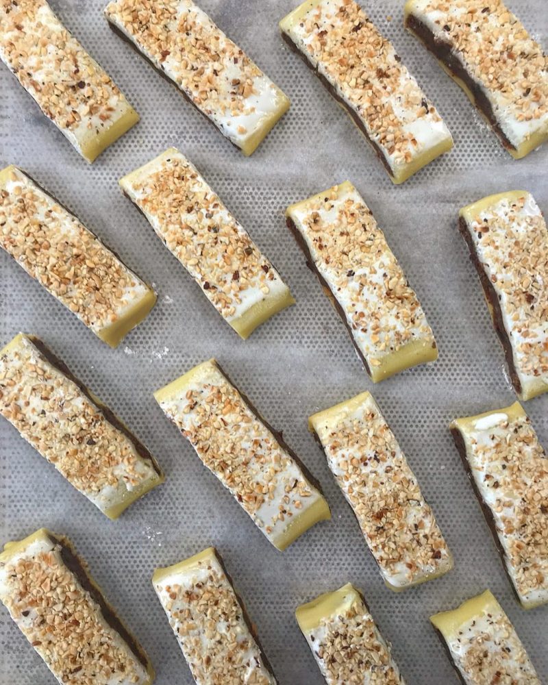 In una ciotolina amalgamare l’albume d’uovo, lo zucchero a velo ed il caramello e poi colare una parte della glassa al centro del dolce. Con un coltello tagliare in varie porzioni il più possibili uniformi e di tipo rettangolare. Cottura in forno preriscaldato a 180 gradi per circa mezz’ora.