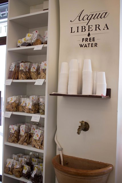 Il locale riprende anche lo stile a stelle e strisce con la caffetteria interna a cura di La Cimbali: una macchina automatica di ultimissima generazione, che permette ai clienti di selezionare la bevanda e scegliere, ad esempio, la dimensione del cappuccino. C’è anche una fontanella che eroga gratuitamente l’acqua di Roma: un’idea simpatica e molto apprezzata dalla clientela.