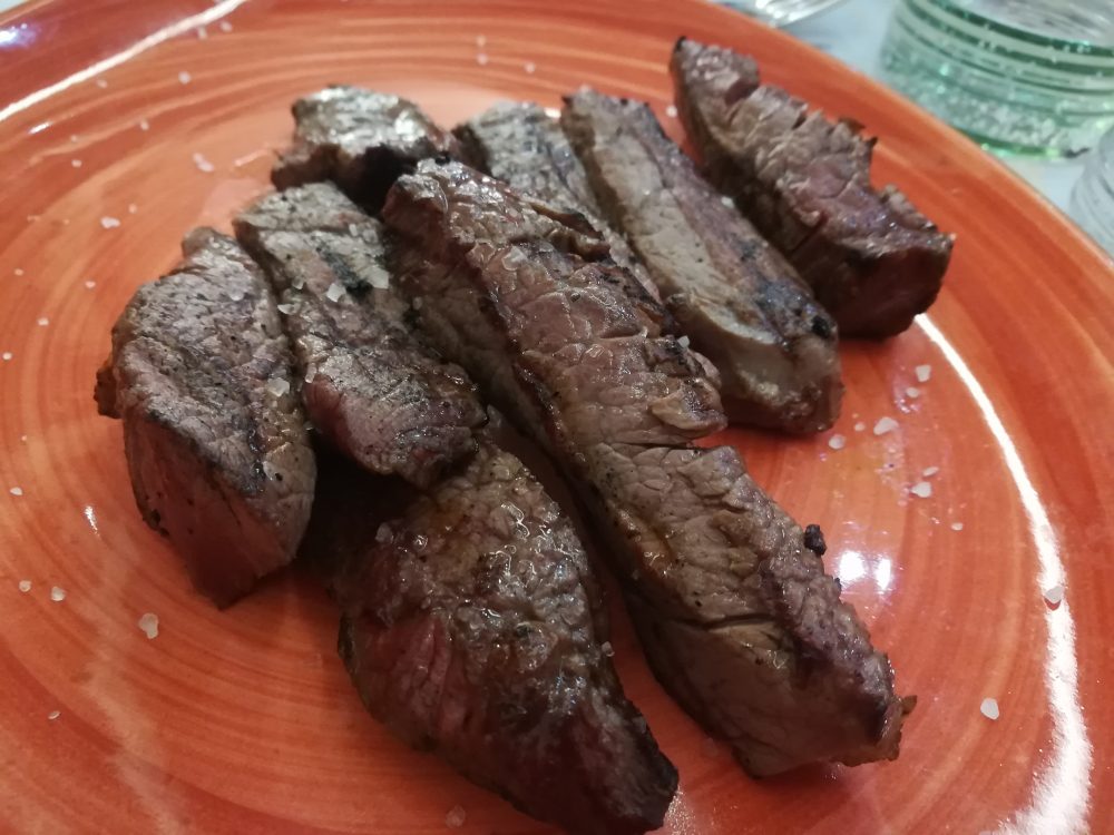 Tra le carni disponibili c’è anche il Manzo Sannita e la Marchigiana Igp, e, prendendo il sopravvento la curiosità, decidiamo di ordinarle entrambe. Ottimo il vitello Sannita ma di ben altro livello la Marchigiana Igp proveniente da allevamenti di San Giorgio la Molara, nell’Alto Fortore! Come contorni ci vengono portate delle patate cotte con tutta la buccia e la cipolla, e un piatto di verza saltata con la pancetta.