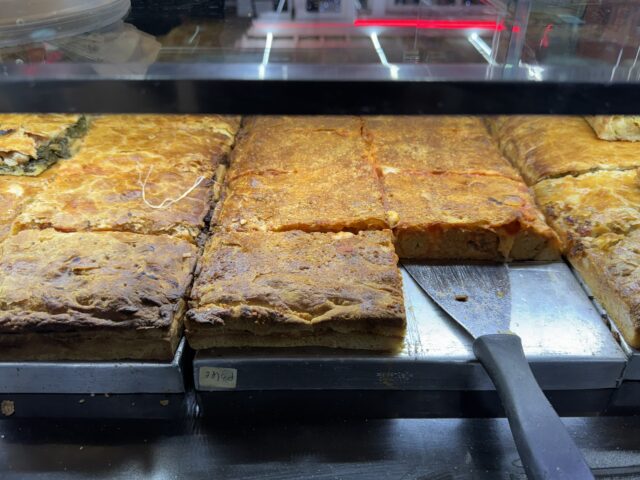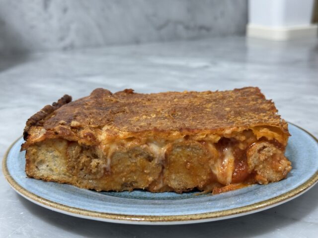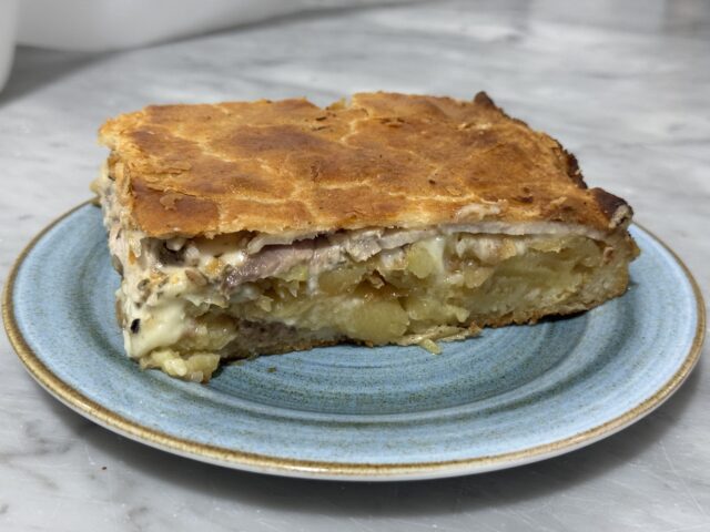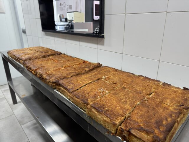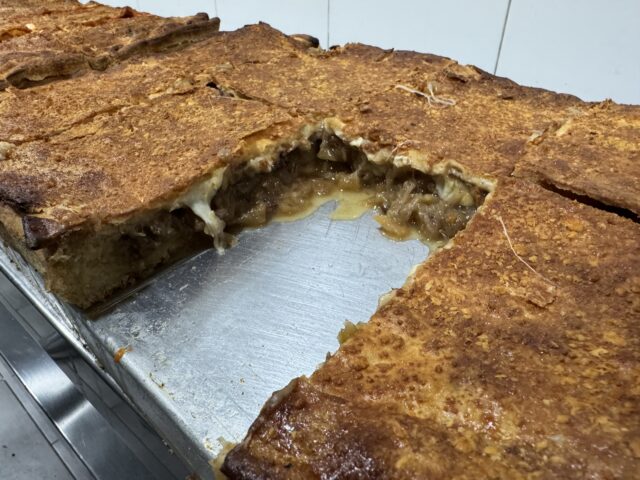 Antonio prepara la pasta sfoglia con burro a sfoglia e per la parte inferiore un impasto diretto a 24 ore di lievitazione, che stende sottile in teglie dove viene farcita e ricoperta con la pasta sfoglia a 7 pieghe.