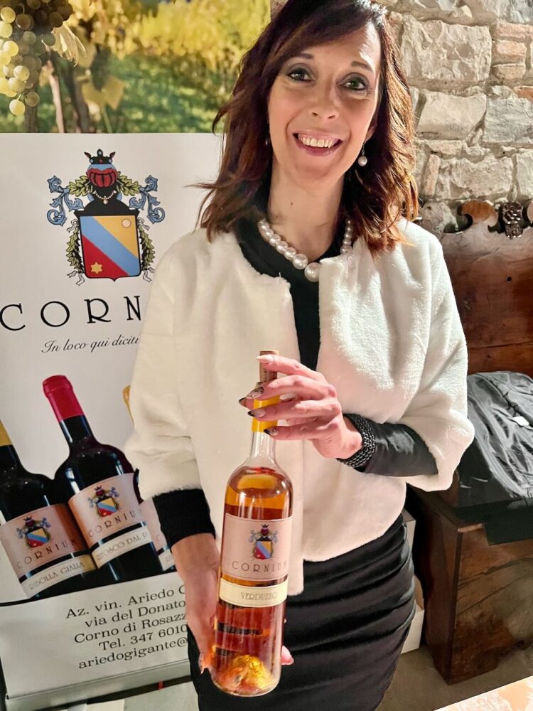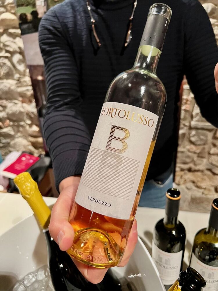 Proseguendo nel nostro percorso, veniamo catturati dal Verduzzo 2021 dell’Azienda Agricola cav. Emiro Bortolusso di Carlino (UD). Colore giallo-oro, leggermente tannico, di corpo, dolce, con profumo di acacia e sapore di miele, equilibrato e piacevole. Ci colpisce la caratteristica di essere “dolce e salato”, grazie alla particolarità dei vigneti al confine dell’azienda ittica Valle del Lovo, a due passi dalla Laguna di Marano in provincia di Udine, di cui abbiamo assaggiato il carpaccio di filetto di branzino al naturale e quello affumicato.