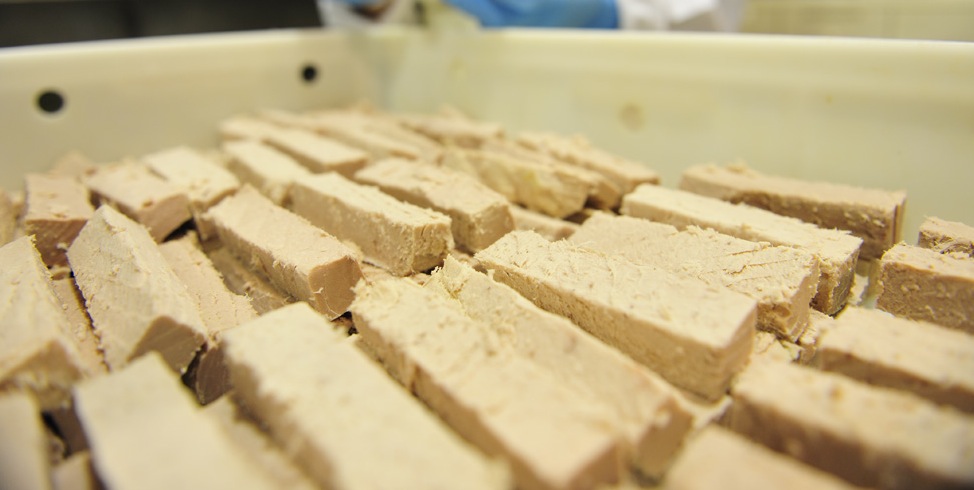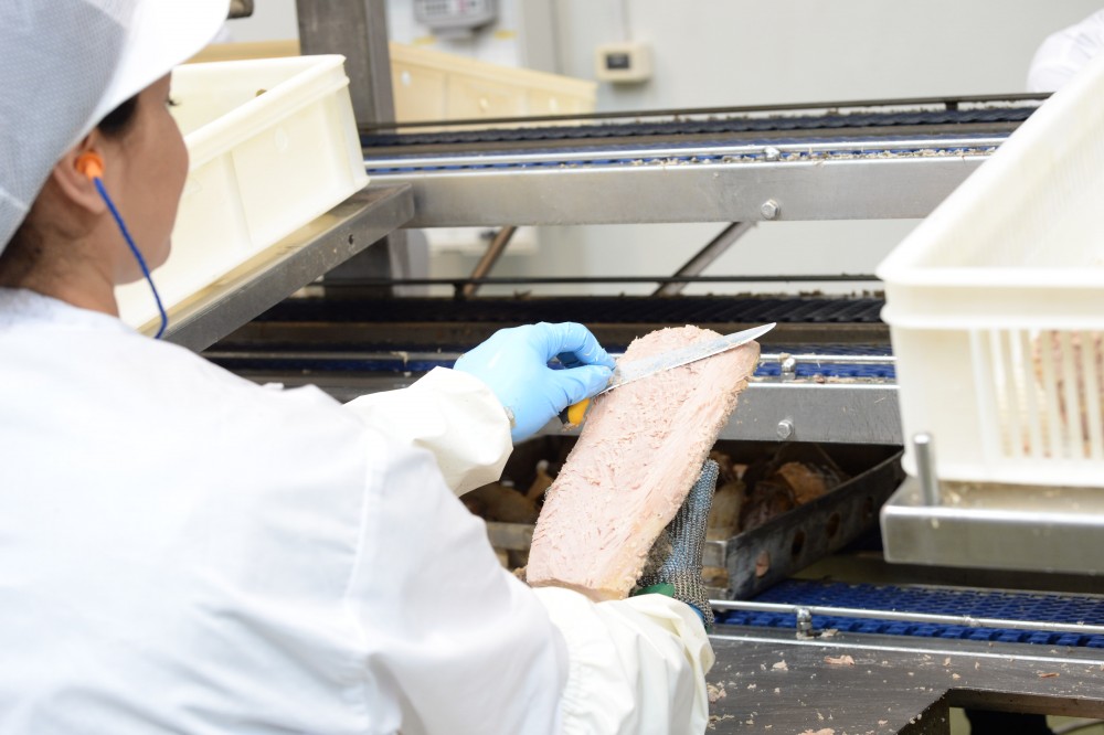 sezionamento: il tonno viene congelato a bordo dei pescherecci e trasferito allo stabilimento dove vengono effettuati i controlli qualità. Dopo lo scongelamento, effettuato con acqua corrente a temperatura ambiente, il tonno viene sezionato, tagliato e lavato;