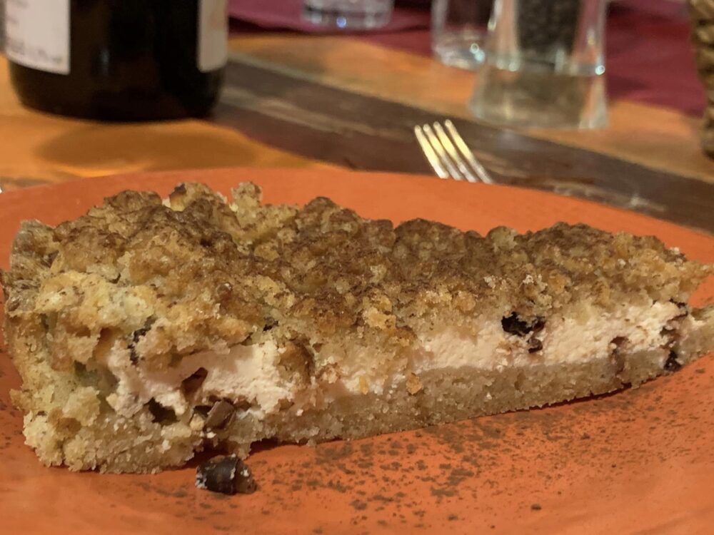 Si chiude con la proposta del giorno, scritta alla lavagna, di un paio di dessert (oltre alle pesche al vino: è pur sempre estate!). Nel nostro caso, un semifreddo allo zabaione e una crostata rustica alla ricotta e cioccolato.
