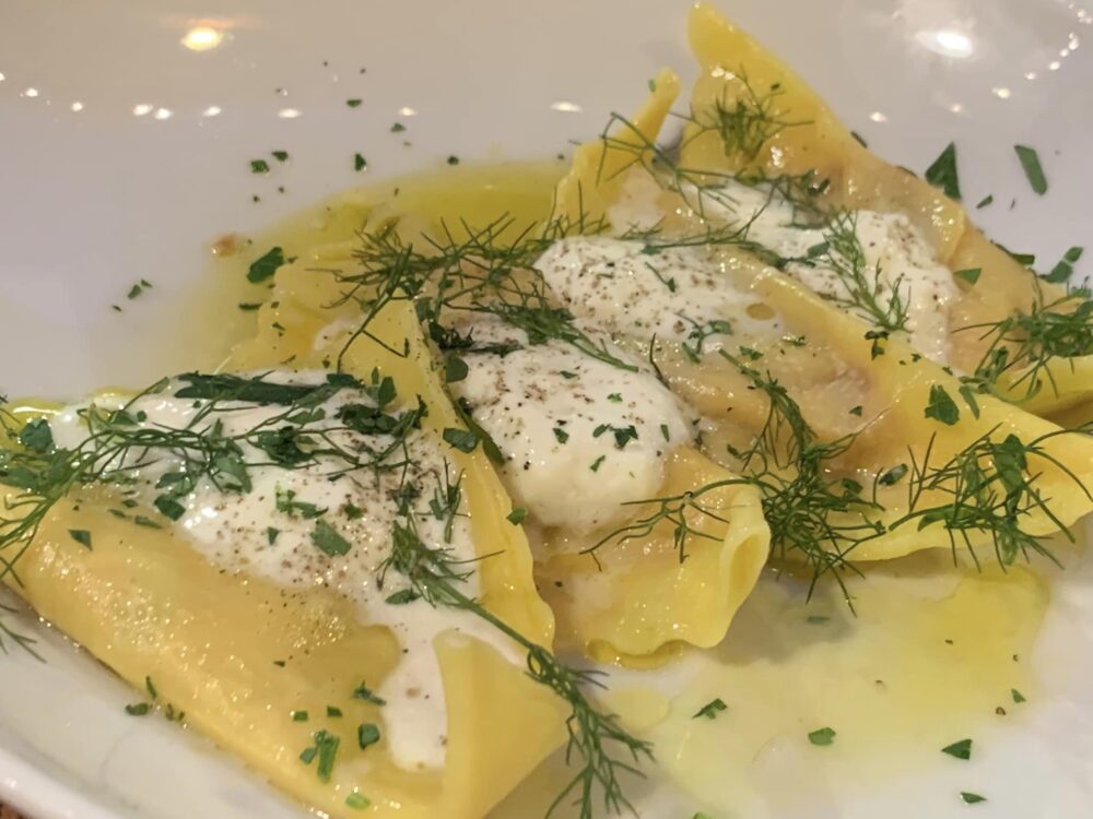Tra i primi, buonissimi gli agnolotti di baccalà con stracciatella, golosi, ricchi e freschi al tempo stesso, grazie alla finocchiella che li guarnisce e completa.