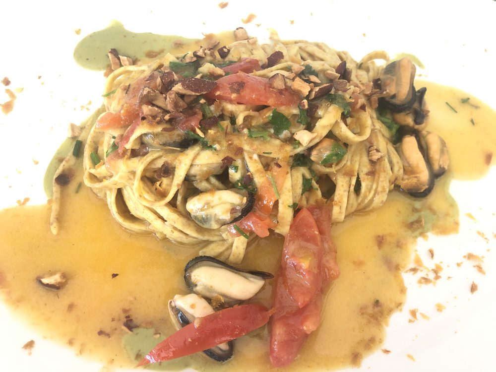 Canneto Beach 2, Tagliolino integrale con filetto di pomodoro ramato, cozze nere di Varano, bottarga di Lesina e Mandorle di Toritto