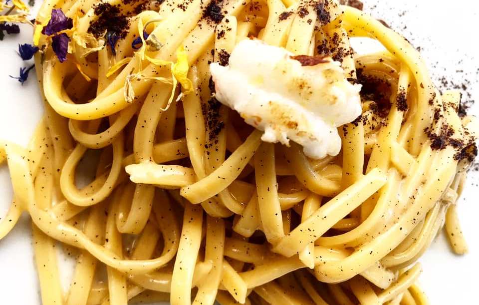 D’Amore, Linguine al Burro di Bufala, Scampi e Caffe’
