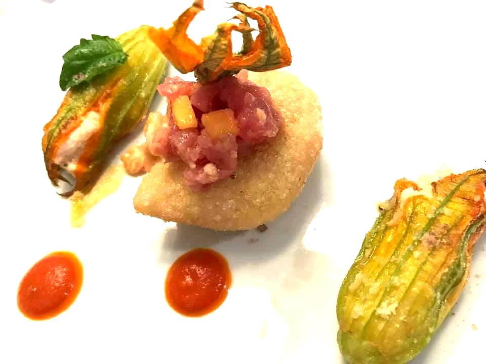D’Amore, Montanarina con Tartara di Tonno e Fiori di Zucca ripieni di Tartara e Ricotta di Bufala
