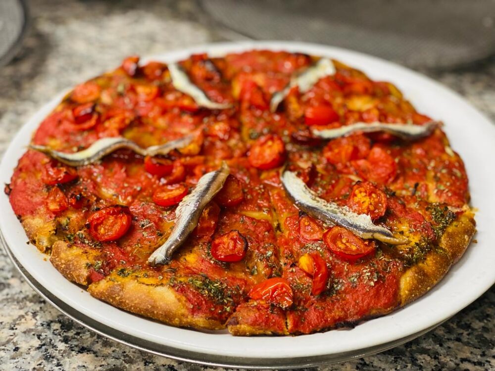 Un mondo a parte è che quello che riguarda la Franceschina, pizza nel ruoto che Michele ha dedicato alla nonna. Quando era ancora studente, la nonna del pizzaiolo cilentano preparava spesso questa pizza nel pomeriggio, quando il nipote studiava e la mangiava per merenda. L’impasto usato è quello del pane di cereali locali, che cresce nel ruoto per molte ore, prima di essere infornata. Il topping è realizzato con sugo fresco, pomodorini ciliegino, cacioricotta del Cilento e alici di Menaica.