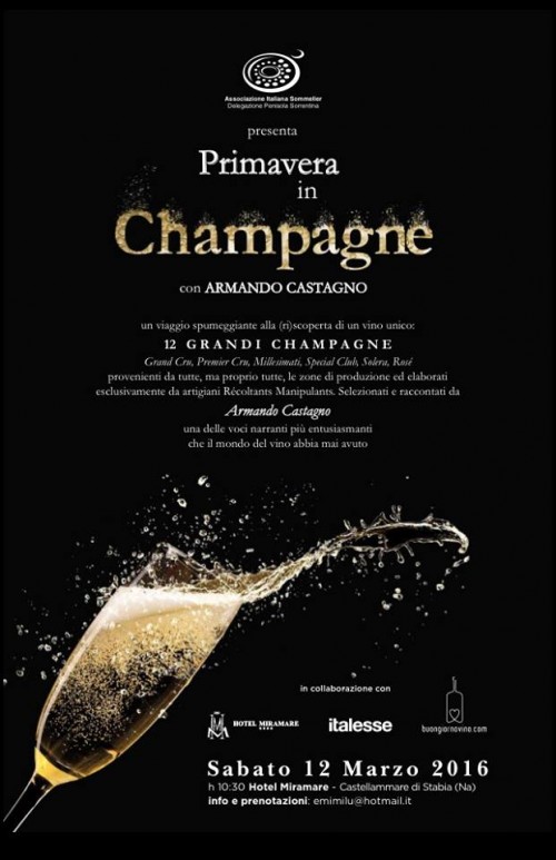 Ricercati champagne in degustazione il 12 Marzo all’Hotel Miramare di Castellammare di Stabia per “PrimaVera in Champagne” con Armando Castagno.