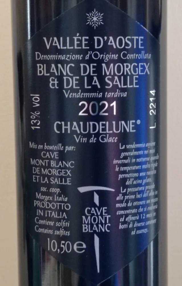 Controetichetta Chaudelune Vin de Glace Vallee d’Aoste Doc 2021 Cave Mont Blanc de Morgex ed De La Salle