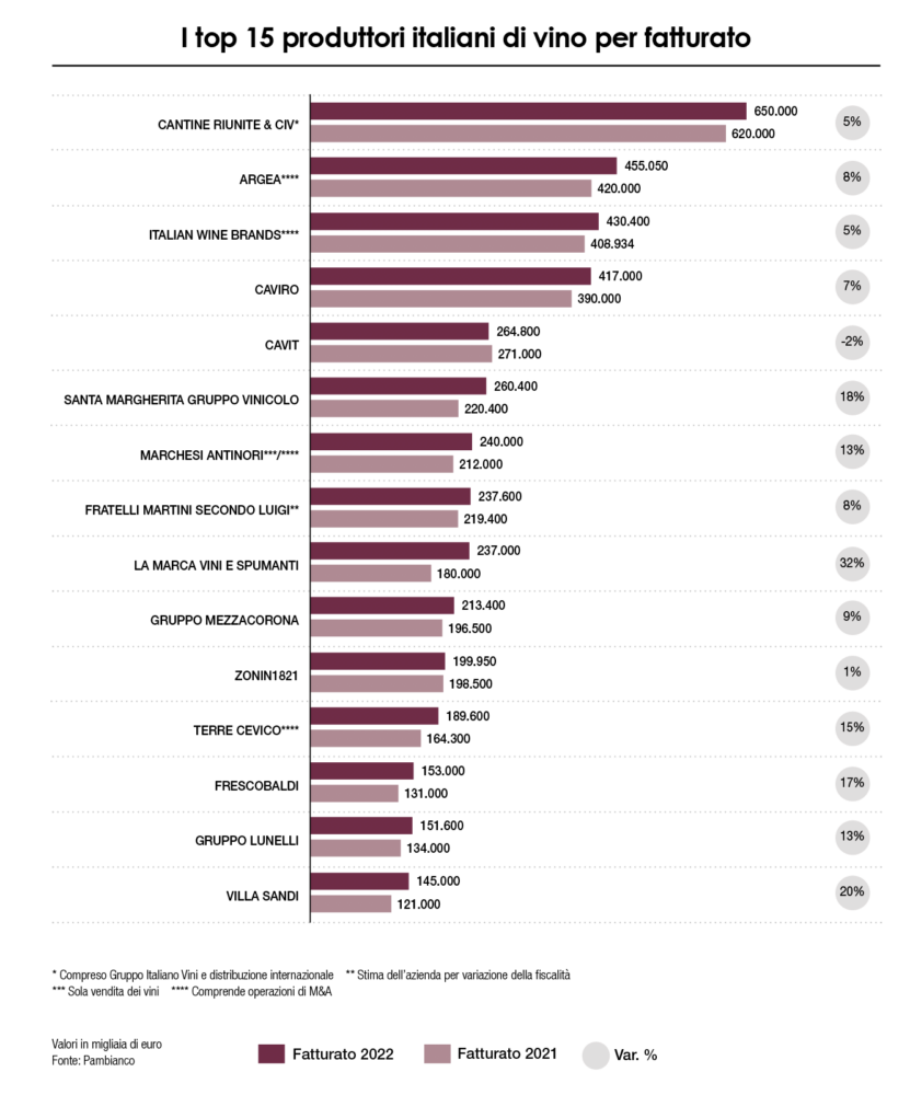 Molto più staccata, come l’anno scorso, c’è Cavit, unica azienda della top 15 a registrare una lieve flessione del -2% causata dal progressivo assestamento post-pandemia e da una crescita meno generosa del mercato nordamericano, si è dovuta fermare a quasi 265 milioni di euro. E questo mentre alle sue spalle Santa Margherita Gruppo Vinicolo ha quasi del tutto recuperato quella cinquantina di milioni di euro che le separavano. Questo perché il gruppo veneto, con una crescita del 18% ottenuta anche grazie all’acquisizione di Roco Winery (Oregon) attraverso la controllata Santa Margherita Usa, è riuscito a superare i 260 milioni di euro. E qui si chiude anche quello che potremmo definire il sestetto dei consolidati.