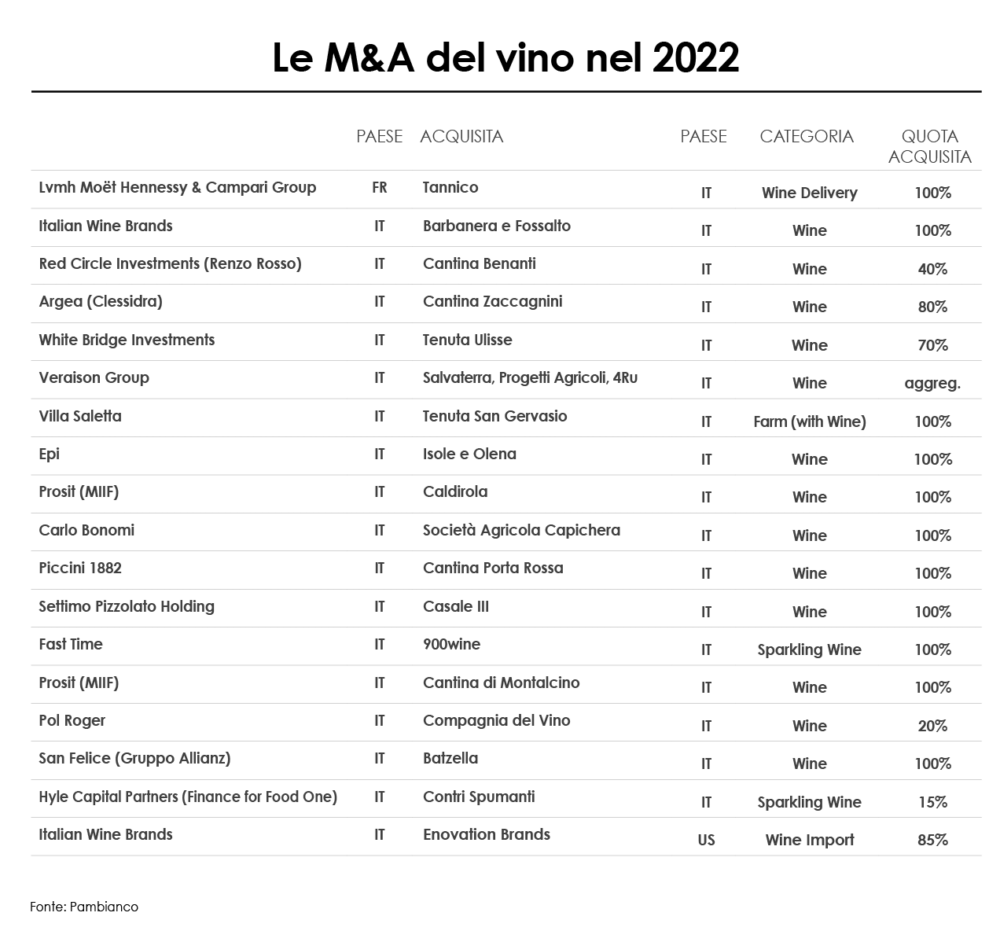 In primavera, nel mese di maggio, il gruppo Prosit, guidato da Sergio Dagnino, ha acquisito Casa Vinicola Caldirola, realtà lecchese da oltre 40 milioni di euro che controlla il marchio La Cacciatora. Operazione questa che si aggiunge a quella di inizio anno, quando il gruppo partecipato da Made in Italy Fund di Quadrivio&Pambianco aveva comprato Cantina di Montalcino. Nel mese di aprile invece, è stata la toscana Piccini 1882 a investire, e lo ha fatto nelle Langhe comprando il marchio, compreso di archivio storico, Porta Rossa. Scorrendo il calendario, a marzo, la trevigiana Pizzolato ha acquistato Casale III, mentre Fast Time, società specializzata nell’attività di importazione e distribuzione, ha acquisito la 900wine produttrice di spumanti nella Valdobbiadene. A gennaio invece, Bell’Aja, società di proprietà dell’Agricola San Felice e controllata dal Gruppo Allianz, ha fatto propria Batzella e i suoi 7,5 ettari di vigneto tra Castagneto Carducci e Bolgheri, mentre Hyle Capital Partners, attraverso il fondo Finance for Food One è entrato nel capitale di Contri Spumanti.