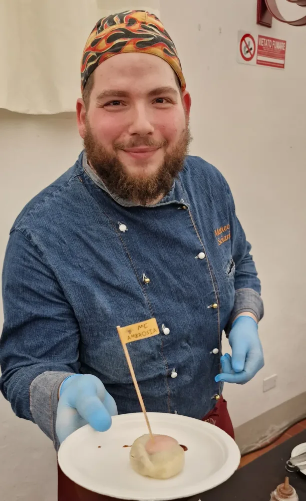 Matteo Sciarri, chef del ristorante Ambrosia di Cortona, ci fa viaggiare in Asia prima di riportarci con entrambe i piedi in Toscana. La sua creazione è un panino cinese cotto al vapore ripieno di stracotto di Chianina affumicato al sigaro toscano, riduzione di teriaki e cipollina in agrodolce. Un assaggio da fare in un unico boccone, ben tiepido, per gustare a pieno la bontà di questo baozi.