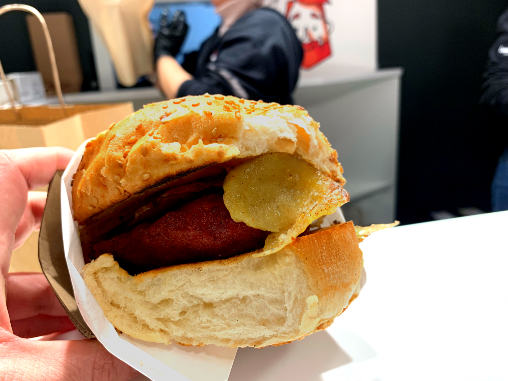 Molto equilibrato e giustamente succoso è Il Maestro Miyagi, con la cotoletta di pollo. Fritta perfettamente accompagnata da patate al forno ed una salsa, Puok Vol.2, studiata per assecondare il gusto tipico del pollame. Su richiesta è possibile aggiungere porro in agrodolce.