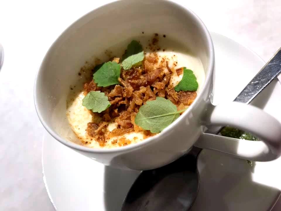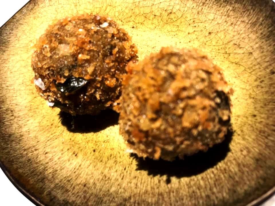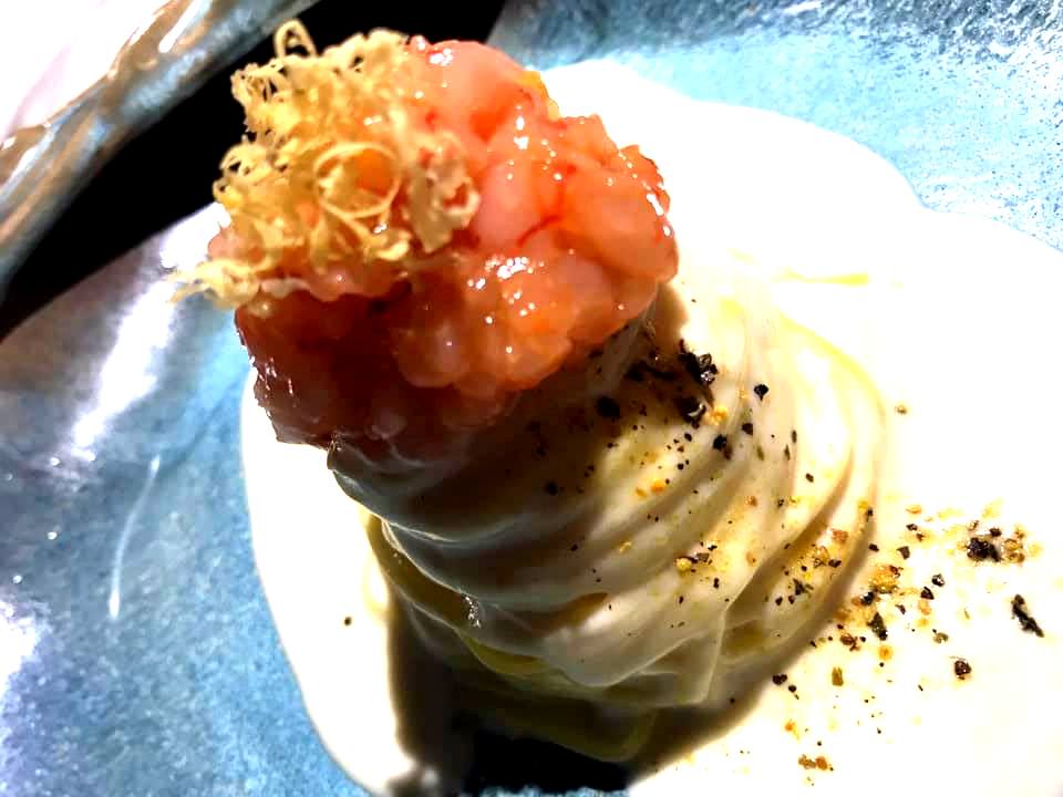 La mousse di patata e polvere di olive nere, ha un cuore gustoso di calamaro mentre la tartarre di gamberi è eccellente e se la maionese di accompagnamento fosse stata al lime (un tocco di acidità) , il piatto sarebbe stato perfetto. La qualità della materia prima non si discute, è il top.