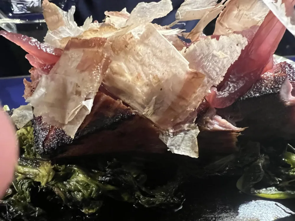 Il resto della cena è però andato alla grande, ci è piaciuto il modo di affrontare il tonno senza mediazioni sia con la polpetta in un ottimo sughetto di pomodoro sia come tataki, un filetto di carne in pratica.