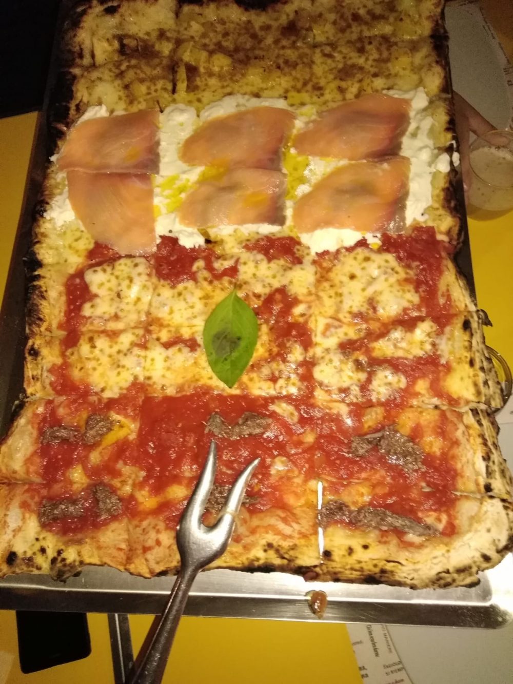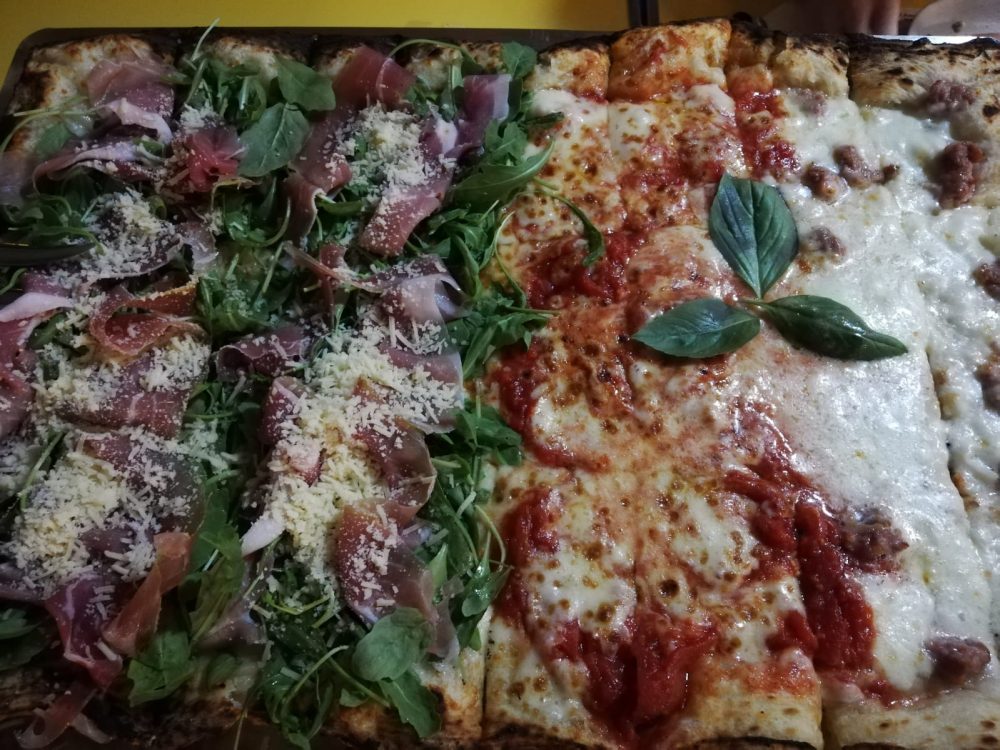 La formula è divertente: tutti gustano vari sapori e si confrontano abbinamenti e preferenze; non è una degustazione ingessata, piuttosto un’allegra social table. I topping , oltre ai classici margherita e marinara sono una ventina e potrebbero fare un salto di qualità se si puntasse su una selezione più accurata degli ingredienti e su abbinamenti più bilanciati. Molto giusto e lodevole l’uso del pomodoro San Marzano. Sul ventaglio delle pizze proposte spiccano la Salmonata con filetti di salmone, avocado e straccetti di burrata su base bianca, la Bottarga e Patate con bottarga di Cabras, patate e bufala dop, la Parma e Grana.