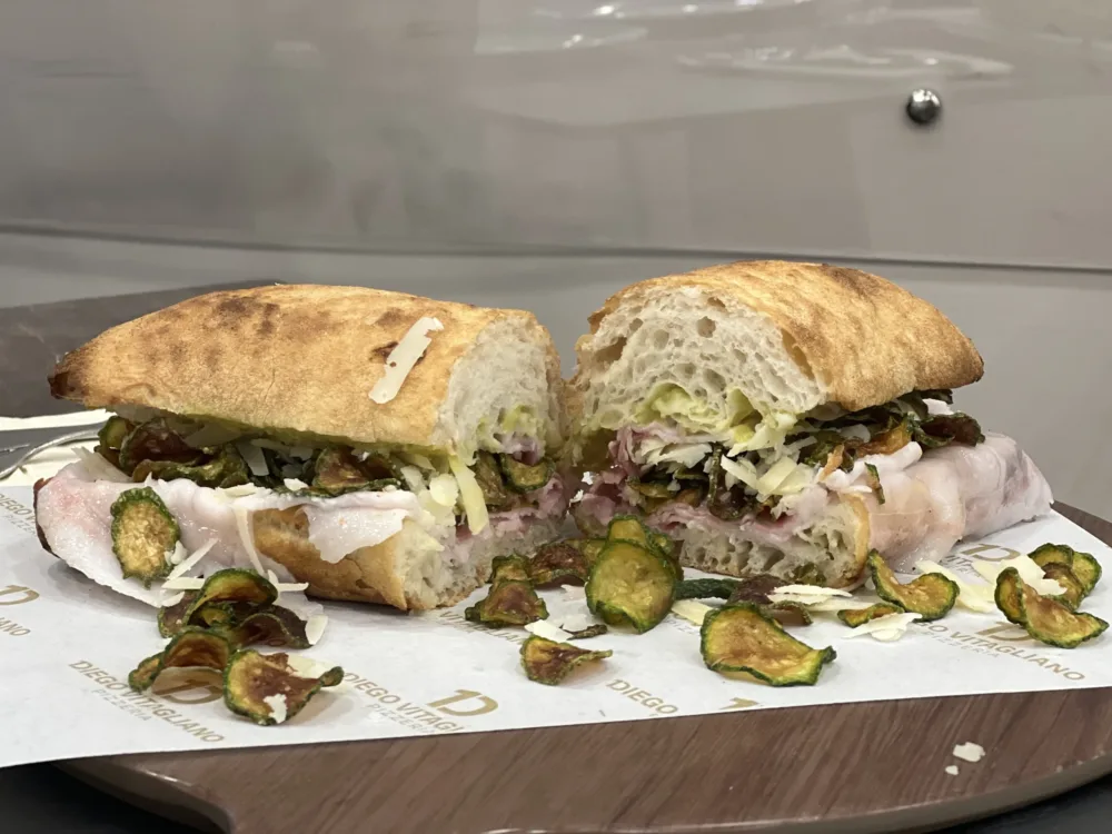 Le cose si fanno serie con il Doppio Crunchy di impasto fatto a ciabatta: crema di zucchine, chips di zucchine fritte, provolone del Monaco, lonza di maiale tranquillo selezione Stefano Bettella. Come ho detto allo stesso Diego seduta stante avrebbe potuto metterci anche della moquette bagnata all’interno, sarebbe stato buonissimo lo stesso. L’impasto è fragrante, profumato, perfetto nella forma e nel colore. La superficie croccante ma non graffiante nasconde una mollica quasi a spirale. L’alternanza di alveoli dà leggerezza e corpo. Il ripieno è preciso, piacevole, tutto si sente e tutto si fonde in un unico morso.