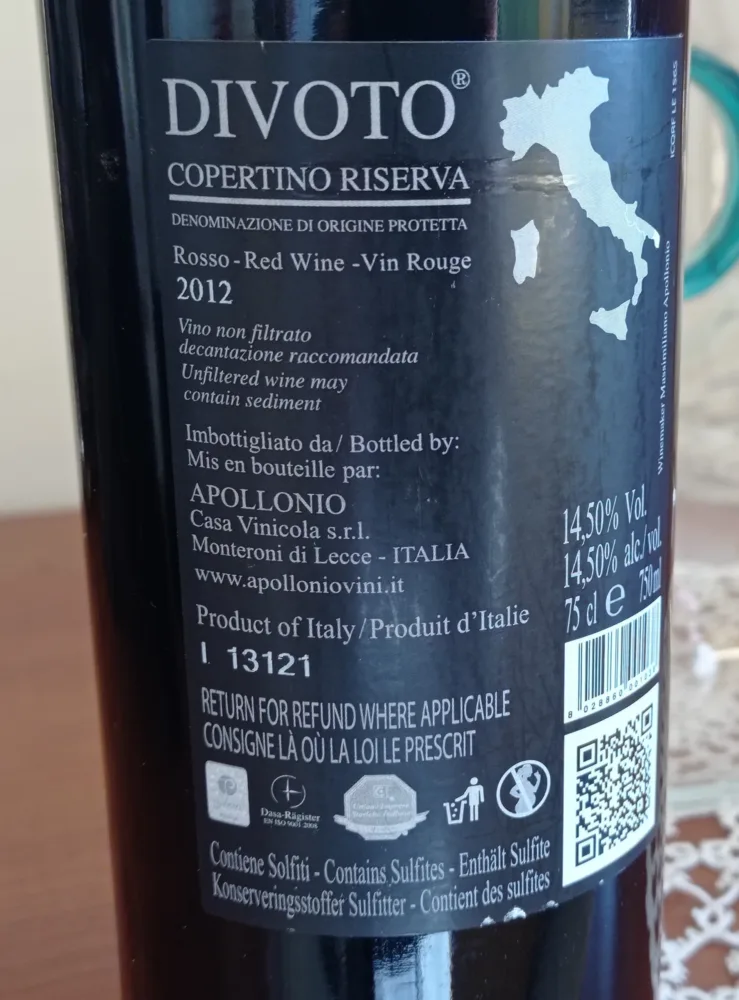 Scava e scava dalla mia cantina riesco sempre a scoprire delle preziose chicche enologiche di ottime annate. Stavolta ho scovato una bottiglia di un pregevole vino salentino: Divoto Copertino Rosso Riserva Dop 2012 della prestigiosa e storica Casa Vinicola Apollonio di Monteroni, appartenente ai fratelli Massimiliano e Marcello.