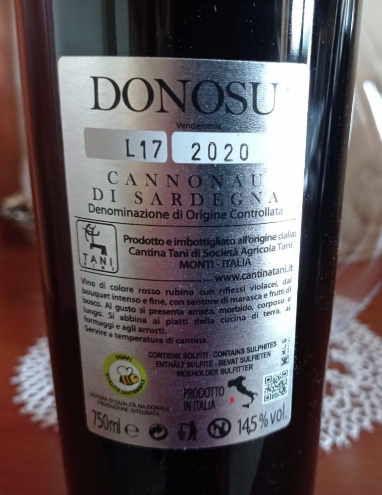 Controetichetta Donosu Cannonau di Sardegna Doc 2020 Cantina Tani