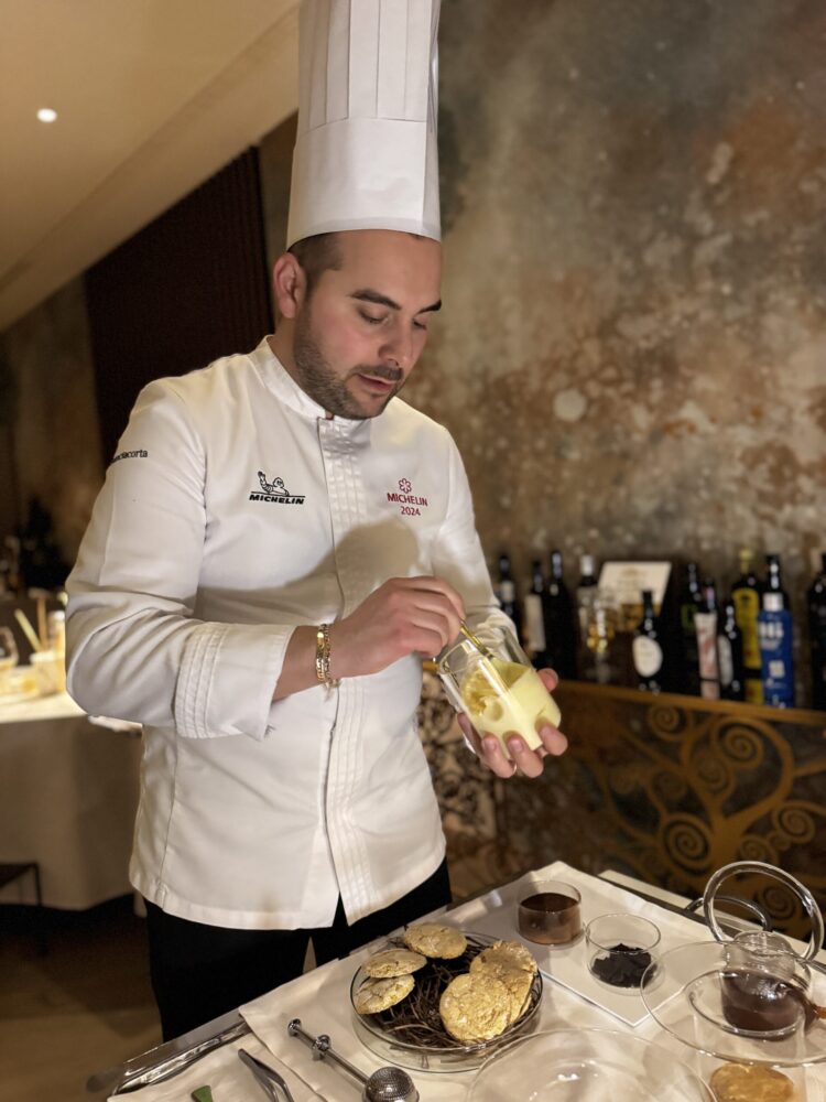 Omaggio alla sua di terra, il ferragosto romano è stato a mio avviso il piatto più iconico della serata. Ciò che sembra una tagliatella al ragù è in realtà un assoluto di pollo e peperoni, come tradizione romana vuole. Il pollo di Laura Peri lo si riconosce tra mille. E anche la sua pelle farcita ha un sapore straordinario. Suggerita la scarpetta con la rosetta soffiata romana, non me lo faccio ripetere due volte. Fare la scarpetta in uno stellato ha un sapore straordinario.