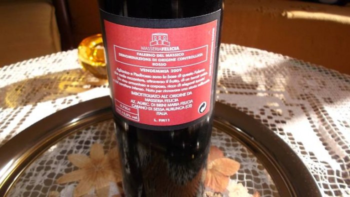 L’etichetta base è il Falerno del Massico Rosso Doc, di cui ho degustato il millesimo 2009. Classico e territoriale blend dell’Alto Casertano composto da aglianico in modo prevalente e saldo di piedirosso. Solo acciaio per la fermentazione e l’affinamento, che poi prosegue in boccia. Tredici e mezzo i gradi alcolici.