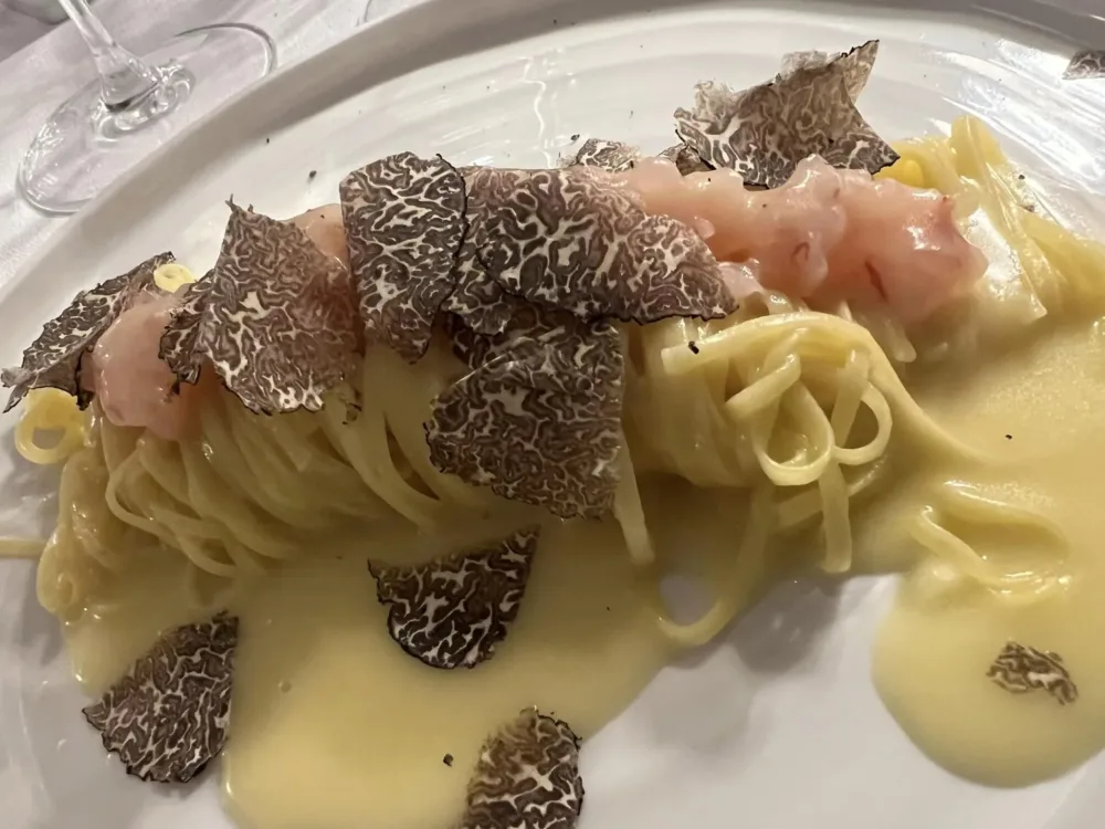 Falero: tagliolini con burro, gamberi e tartufo nero pregiato