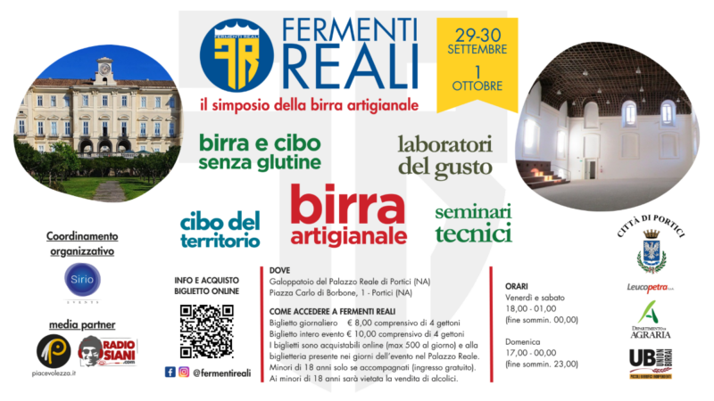 Venerdì 29 settembre prende il via Fermenti Reali, una tre giorni dedicata alla birra artigianale presso il Galoppatoio del Palazzo Reale di Portici organizzata dal Comune di Portici.