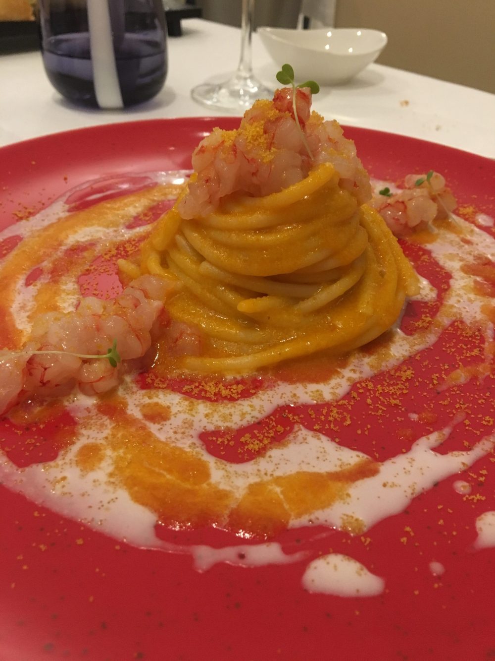 Una ode al territorio, un concerto di Calabria. Lo spaghettone ai gamberi rossi con burrata e bottarga di muggine è invece una lezione didattica di cucina italiana per le nuove leve. I gamberi ovviamente crudi sono leggermente marinati nel succo di arancia per un allungo agrumato e fresco che ben si sposa con il rosso crostaceo, il dolce formaggio e le sapide uova di cefalo. Cottura perfetta ed impianto che ricorda un Picasso.