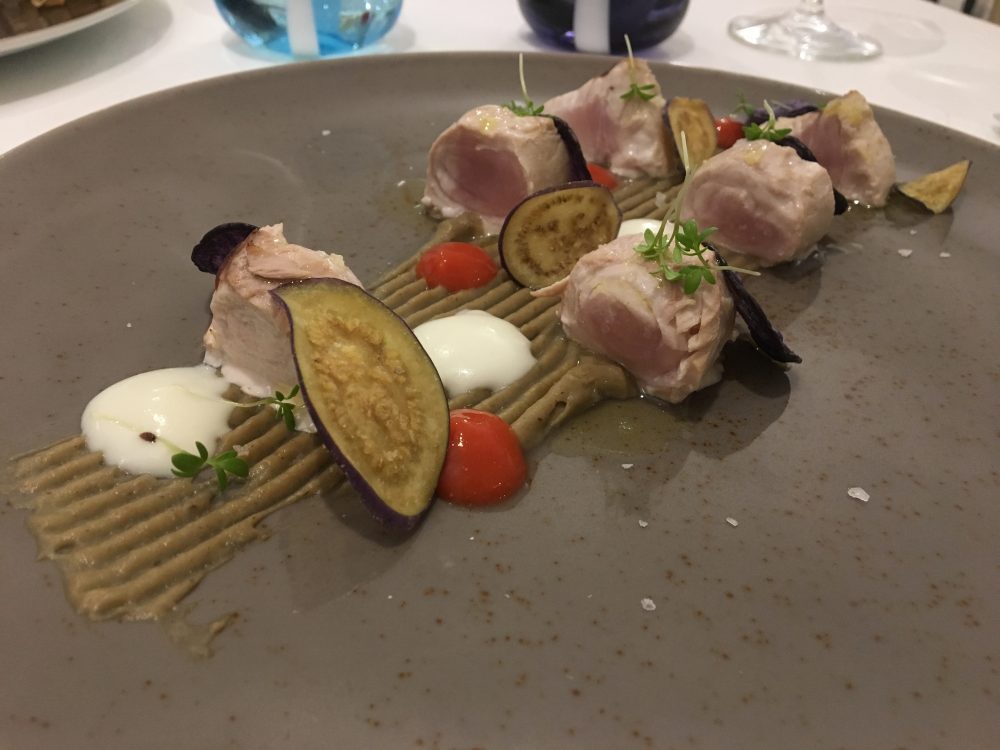 Il tataki di ricciola con patate viola, provolone e melanzane è il secondo che tutti i ristoranti dovrebbero avere in carta… e non esagero!