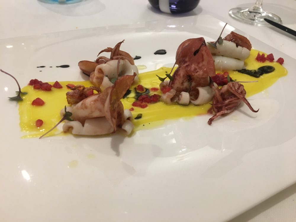 L’antipasto é un contrasto infinito tra dolce ed acido dove la tenacia del totanetto si fonde in perfetto equilibrio con la vellutata di patate allo zafferano e le perle di lampone. I due primi sono un inno alla gioia. Standing ovation allo chef con i complimenti live alla cucina. Molto bilanciate le mezze maniche ai crostacei, zucca e nduja dove la sapidità dei gamberi e dell’ astice è in perfetto equilibrio con la dolcezza della zucca e la piccante aggressività del salume calabro per eccellenza.