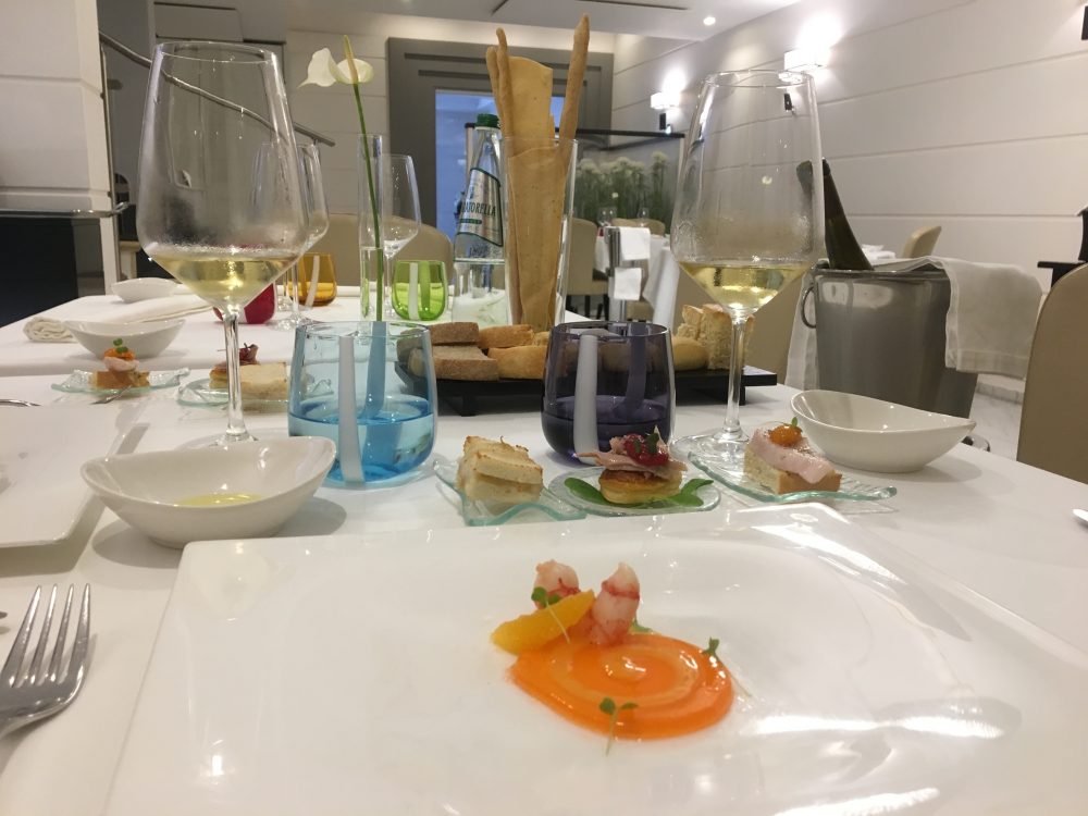 L’olio in assaggio fa ben sperare. L’amouse bouche fatta con gambero rosso, arancia e gelatina di bitter ti rimanda indietro nel tempo quando il cocktail di gamberi e l’aperitivo di benvenuto nelle cerimonie anni ’80 era di buon auspicio per il pranzo che susseguiva, con la differenza che la tecnica di chef Riccardo qui la fa da padrona…tanto che la pizzetta di pasta brisée al tonno sott’olio fatto in casa e datterino confit, il sandwich di gamberi e lardo e il crostino di tonno alalunga cotto a bassa temperatura e datterino giallo passano in secondo piano ma solo ed esclusivamente perché le papille gustative festeggiano ancora commosse… e ringraziano!