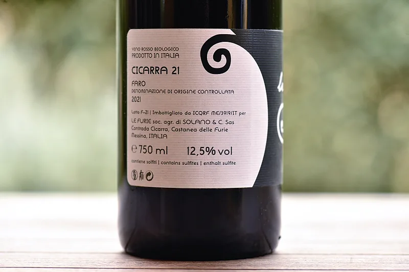 Il Faro Cicarra 21, millesimo 2021, è ottenuto da Nerello Mascalese per il 60%, Nerello Cappuccio per il 20% e Nocera per la restante parte. Nelle prossime annate avrà anche una piccola quota di gaglioppo, consentita dal disciplinare, avendo a disposizione circa 200 piante.