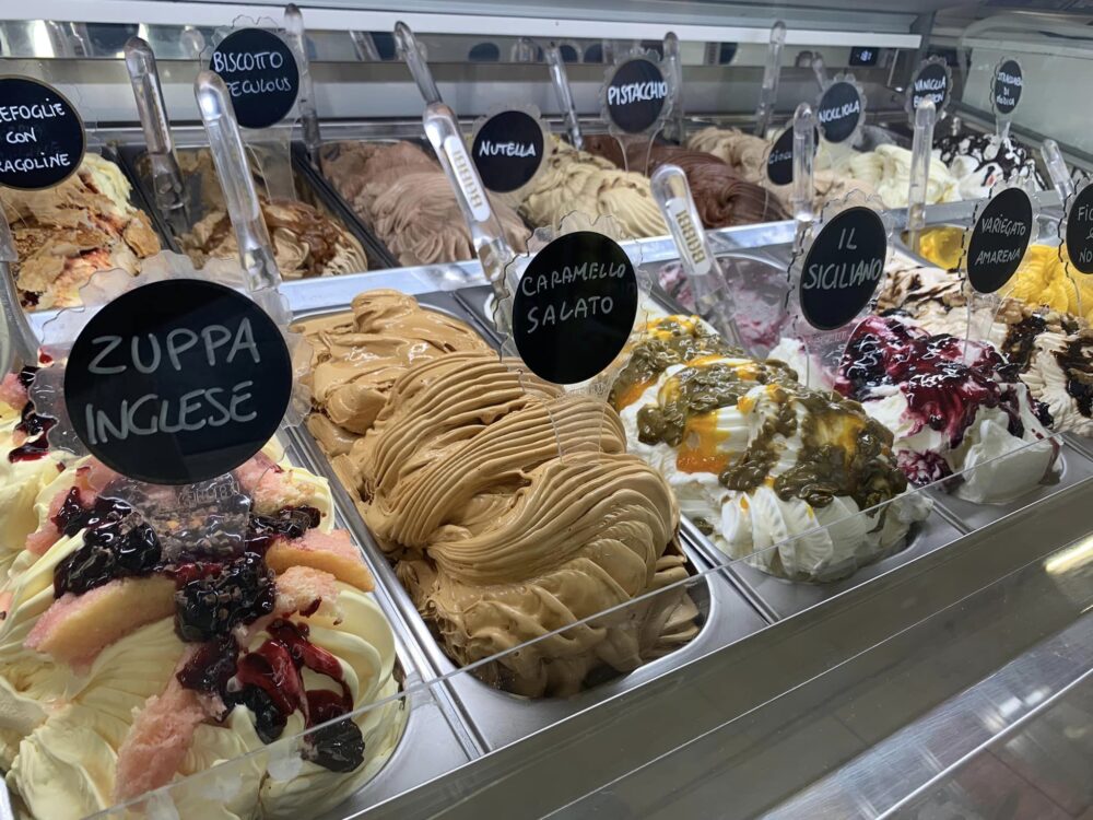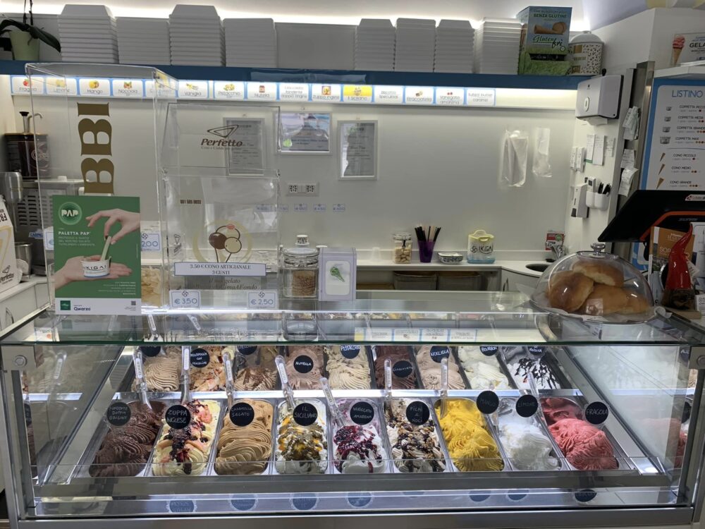 Ai tavoli della gelateria (anche pasticceria moderna, con torte e livitati) si puo’ scgliere tra decine di gusti di gelato: superlativi sia il cioccolato fondente che il pistacchio. Ma il pezzo forte sono i sorbetti, serviti in delizione coppette rialzate in ceramica locale che Marco ha fatto confezionare apposta per lui.