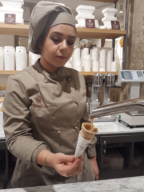 La colata di cioccolato sgorga dalle temperatrici a 40° e arriva direttamente nel cono: una bella tentazione per i golosi di Roma e il segno distintivo della Gelateria e Pasticceria Cremilla, che, lo scorso giugno, ha aperto una nuova sede tra Borgo Pio e Prati, a due passi da Castel Sant’Angelo.