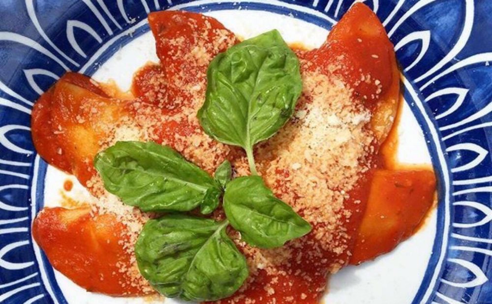 Ed ancora i sublimi ravioli in stile caprese con chiusura a mezzaluna. Ottimo e ben acidulata la salsa di pomodoro, profumatissimo ed aromatico nel complesso il piatto.
