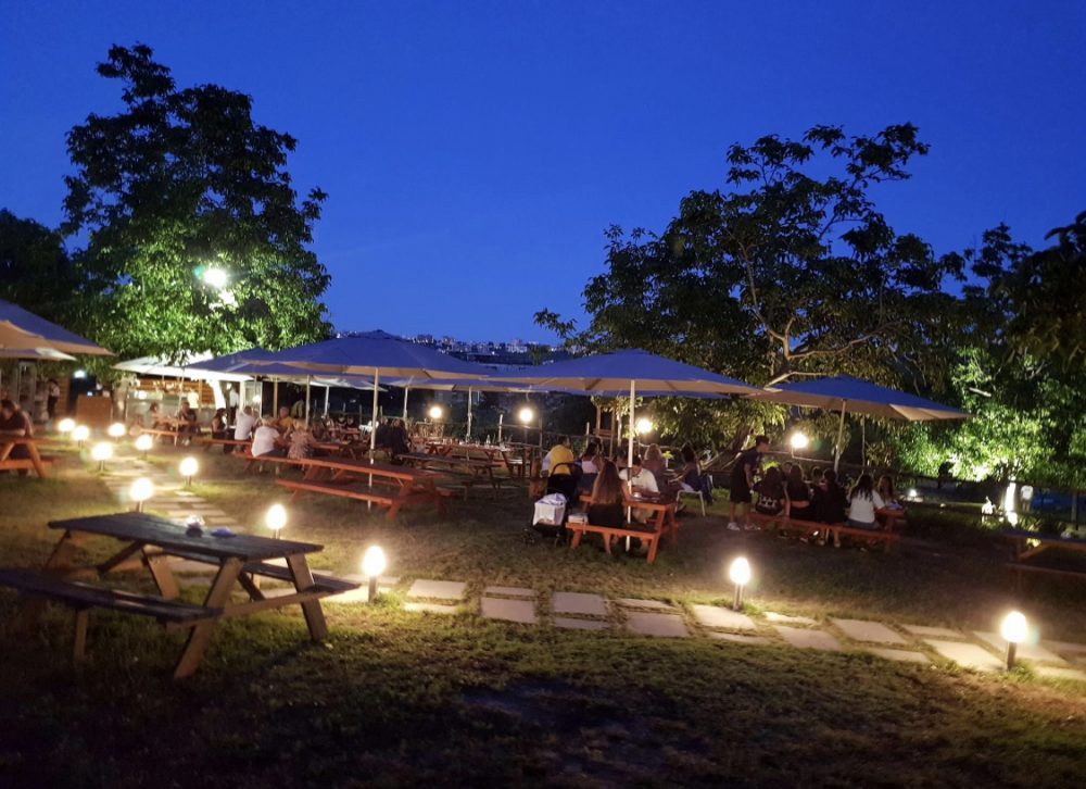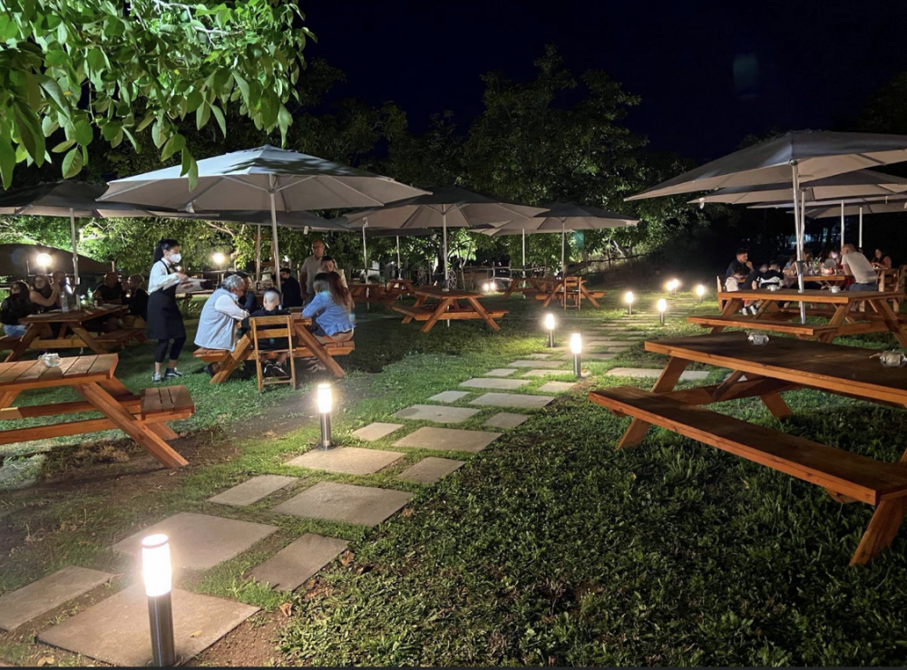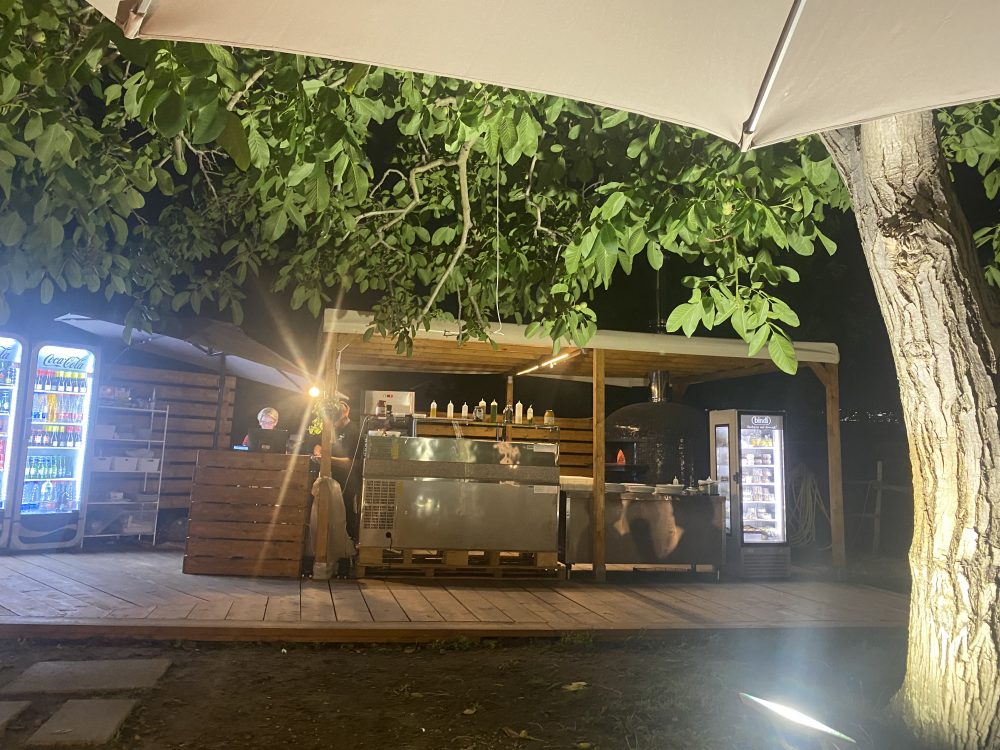 Duecento coperti tutti all’aperto (non ci sono ambienti chiusi) sistemati su tavoli di legno, sotto alberi e tende da sole, con un panorama incredibile che di sera, a lume di candela, diventa ancora più bello.