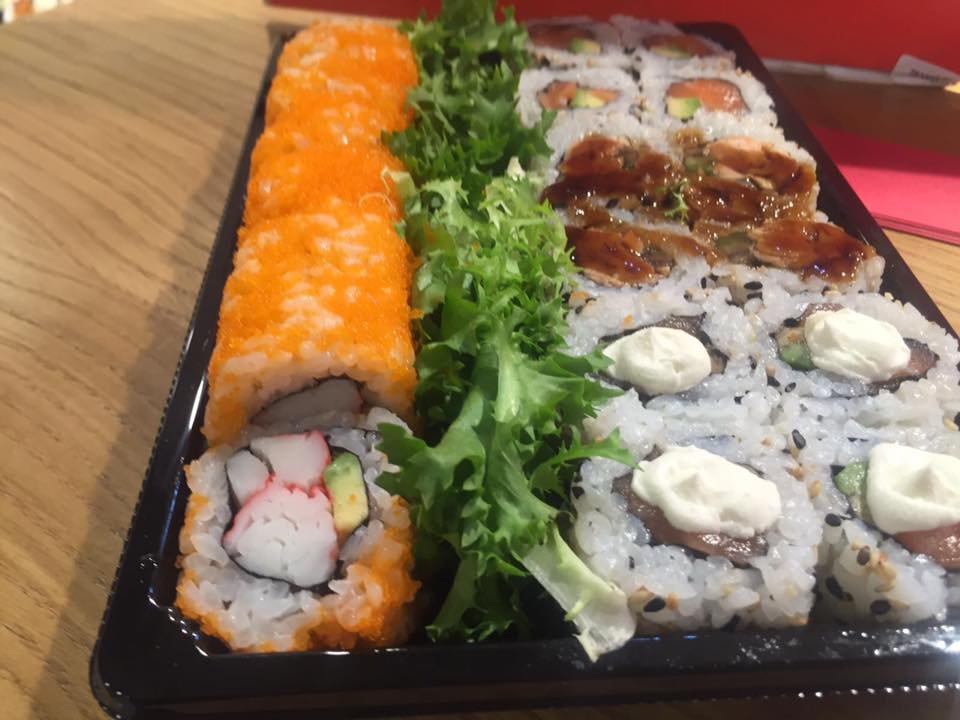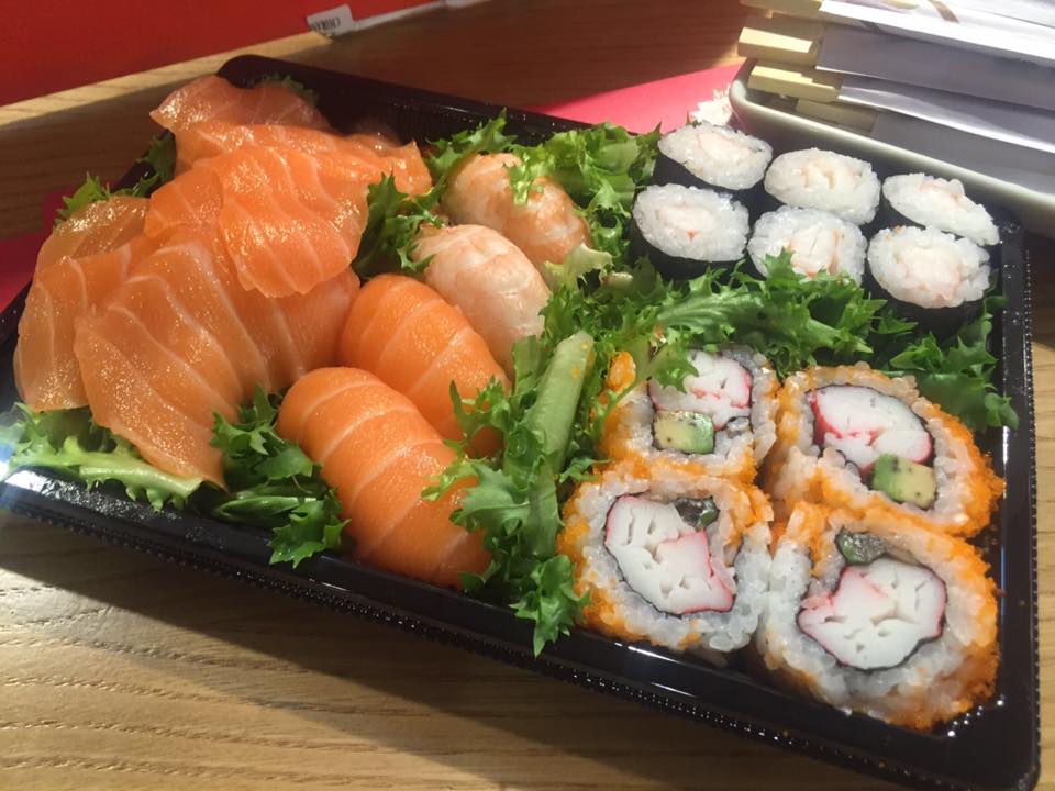 La prima proposta che ho provato è quella basica, con nigiri, sashimi, dei semplici ebi hosomaki e dei kani tobiko uramaki, uramaki con polpa di granchio e uova di pesce volante. Innanzitutto un grande applauso bisogna farlo al riso. Davvero di ottima qualità. Chicchi di qualità Nishiki non troppo acidulati, in cui il bilanciamento tra aceto di riso, zucchero, sale,mirin e qualche goccia di succo di limone, è specificatamente pensato per esaltare il sapore e preservarne la fragranza anche se leggermente refrigerato. Un riso quindi pensato per mantenersi sempre fresco, compatto ed al tempo stesso scioglievole nel corso della giornata. Le materie prime, il pesce sono di notevole caratura, ovviamente il pesce è quello più consistente, salmone, gamberi, polpa di granchio e tonno. Il taglio del sashimi è notevole, sicuramente superiore a qualsiasi take away da banco. Insomma buono. Per ciò che concerne il sapore infine, il punto di forza sta proprio nelle note lievi, nel bilanciamento degli esaltatori di sapore, è facile sbagliare la misura, ma qui sia il riso, sia gli abbinamenti sono netti e precisi, non troppo accentuati come deve essere. Pensati per essere public friendly, appetibili ad una fetta di pubblico più ampia possibile. Concretamente il colore vivido del salmone dimostra quanto detto.