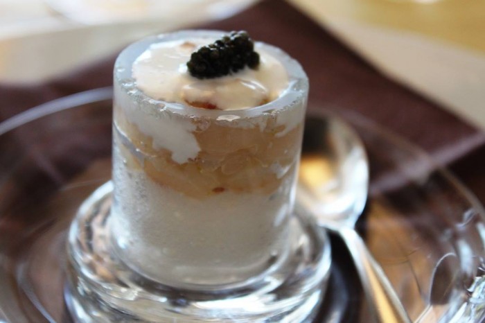 Dispensa Pani e Vini, gamberi in bianco e nero tartare di gamberi con spuma di agrumi panna acida e caviale