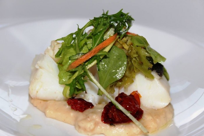 Oasis Antichi Sapori, baccalà islandese in olio cottura, crema di sedano rapa, profumo di arance, misticanza e pomodorini confit