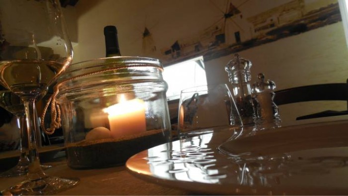 L’apparecchiatura del tavolo è elegante, bella la grossa candela. Romantico. Caldo.