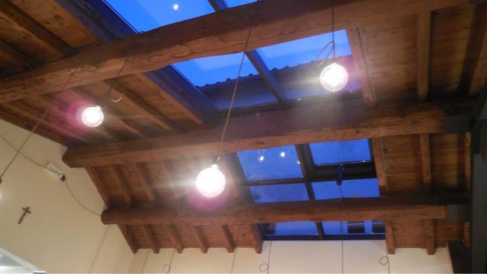 Appena entrati nella sala, fa meraviglia di sè il lucernario. Sopra di noi. Cielo blu case e finestre.