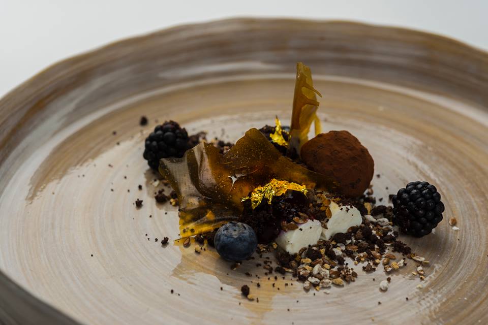 Sous Bois: cremoso al tartufo nero, lamine di liquirizia, terriccio al cacao, confit di cassis e frutti rossi